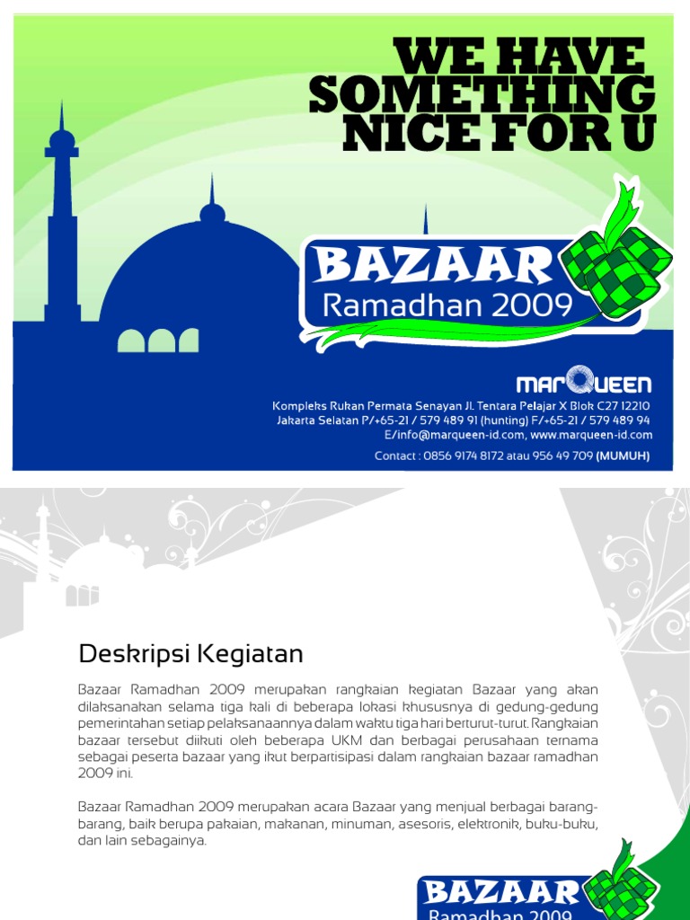 Proposal Kegiatan Bazar from imgv2-1-f.scribdassets.com Ki mangunsarkoro no.8 (0285)391423 batang 51211 proposal bazar ramadhan. Kepala gedung sentul international convention center (sicc) dr. Berdasarkan kamus besar bahasa indonesia, proposal adalah rencana yang dituangkan dalam bentuk rancangan kerja, perencanaan sistematis, matang, dan teliti yang dibuat oleh peneliti sebelum melaksanakan. Latar belakang upaya peningkatan mutu pendidikan merupakan suatu kegiatan yang tidak pernah lepas dari perhatian kita semua, oleh karena itu perlu adanya strategi yang tepat untuk melaksanakannya, salah satu program yang akan dilaksanakan oleh sman 3 sengkang berkenaan dalam hal ini yakni bazar. Kegiatan pentas seni dan bazzar universitas harapan bakti jakarta. Kegiatan pentas seni dan bazzar universitas harapan bakti jakarta. Demikian proposal kegiatan ini disusun dengan pengharapan agar diteliti,dipertimbangkan dan diberi masukan yang membangun.kami sangat berterimakasih sekiranya kegiatan ini dapat segera dilaksanakan dan atas segala bentuk dukungan dan bantuannya, sekali lagi kami mengucapkan terimaksih. Proposal kegiatan bazaar dan baksos.